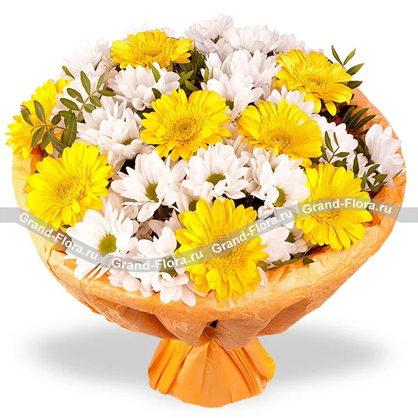Лаконичный букет в бело-желтых тонах, не так прост, как кажется на первый взгляд. В нем отражаются летние дни, наполненные счастливыми воспоминаниями, теплым ветром и солнечным настроением. Легчайшие белые хризантемы и жизнерадостные желтые герберы, напомнят о самом счастливом времени, придадут сил и уверенности в том, что жизнь прекрасна в любом ее проявлении.